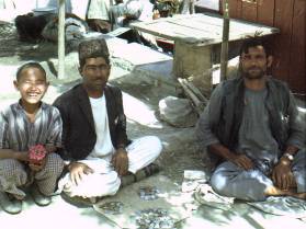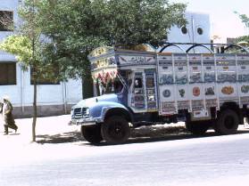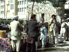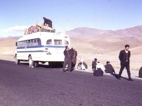 For lunch we stopped at a rest house with a swimming pool. The swimming pool is worth commenting about because it was the last thing that we would have expected in this part of the world. Despite all the mod-cons of the rest house, it was a very inexpensive lunch. Later in the month was the road race from London to Sydney passing through Afghanistan the same route as we were travelling. During the day we saw the occasional rally cars going the other way heading back to London ready for the start after having practised for their forthcoming race. As the journey progressed the driver noticed that he was running very low on diesel so he left the road to find a small village where we were lucky enough to find a diesel fuel pump. There was no electricity in the village so the diesel had to be pumped by hand. There was a large handle on the front of the pump that we took turns to rock back and forth. Eventually the tank was filled at a cost of just 100 afs, and the driver made it plain that we had to pay for. When we arrived in Kandahar at 6pm it was already dark. The Pakistanis helped us to find a hotel for the night, but before they would let us take our packs out of the boot they demanded that we pay them for the lift. We pointed out that they hadn't told us they expected payment before we got in, and that we had already paid a lot more than half of the fuel cost for the journey. They refused to give us our bags until we had paid them and so we threatened to go to the police. Eventually after some arguing they threw our bags out into the road and drove off at speed. We decided that it would be wise not to check into the hotel where we had been dropped off in case they decided to come looking for us. They had been in quite a temper and we decided to err on the side of caution and look elsewhere. We didn't have much luck in finding a hotel room because most of them had been filled before it got dark. Eventually we managed to get two beds without blankets in a partitioned section of the Hotel Pashtunian for 18 afs each. For supper we found a typical Afghan restaurant where everybody sat with crossed legs on the floor. We had to eat our meals from a tray placed in front of us. The meal consisted of a plate of rice with a piece of fatty meat in the middle of it costing just 10 afs each. Somebody came around and offered us some special Afghan sauce for an extra 2 afs, and we decided to give it a try. It was a black watery substance and I didn't like the taste too much. When we had finished eating and started to walk back to the hotel we felt a bit strange. It wasn't until we mentioned it to somebody else that we found out that the special Afghan sauce was made from cannabis resin (hashish). Back at the hotel we spoke to 2 Afghans who were going to Kabul the next day in a jeep. We asked them for a lift and they agreed if we could be ready to leave at 7am. Unfortunately the next morning when they knocked on our door at 7am we were still in bed. Even though we managed to get dressed and be downstairs within 5 minutes, they had gone without us. We decided to catch the bus to Kabul and after making enquiries at the bus company office we found that the last bus was due to leave at 7.50am. We decided to go and have some breakfast in the same restaurant that we had eaten in the night before. This time we decided not to have the special sauce, but to restrict ourselves to some tea and a bit of bread. Ten minutes later we walked back to the office to find that the bus was ready to go. We only just had time to buy our tickets and get on board before it left at 7.20. At the edge of the city the driver filled up the tanks. Most unusually for a bus it ran on petrol and not diesel. When we had been travelling for about two hours the bus stopped in the middle of nowhere. Everybody got off and all the men went to the toilet at the side of the road. The Afghan women dressed in their tent like clothes were not able to go, and presumably had to wait until lunchtime for an opportunity to relieve themselves. It wasn't until after 1 o-clock before we stopped for lunch. The bus turned off the main road and drove for a few miles until we reached a small village. The driver dropped everybody off and drove the empty bus away. We bought some bread and fruit and ate it as we walked around looking at the village. We came across our bus driver who was draining petrol out of the fuel tank and selling it to somebody.