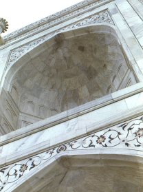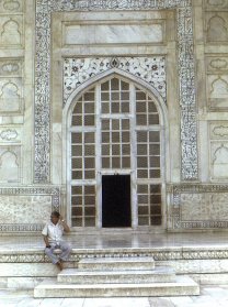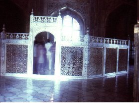 Urban traffic in India is a miasma of vehicular and non-vehicular traffic. It includes such diverse things as cars, trucks, motor-rickshaws (three-wheeled taxis), cycle-rickshaws, motor scooters, elephants, goats, dogs, children, chickens, bearers, push-carts, camels, buses, etc. These things are all moving. If you want to pass anything, you just have to honk your horn and everyone else will start honking too. If you don't have a horn, then shout. The one who is loudest gets the right-of-way and everybody else moves over to the left (unless they are in a hurry and everyone in India is in a hurry). If the other vehicles and livestock don't yield to the loudest horn, that vehicle with the right-of-way then enters the lane of oncoming traffic and passes those ahead. This is especially so on a busy street at rush hour and can be good fun when you are on the wrong side of the road in a flimsy motor-rickshaw, with a truck bearing down on you. If moving traffic isn't enough to keep you occupied, you also have a number of stationary targets, (err, obstacles), including cows, beggars, street repair crews, double-parked cars and trucks and elephants. Because the pavements are being used by the shopkeepers to store and display their stock and what space remains is used for parking various motorised and non motorised contraptions, the road is also the main walking area for pedestrians. Whatever else happens, you are always in the right just as long as you don't hit the cows. The cows can be ANYWHERE in the street and often just wander out in front of the traffic without any warning, almost as if they are challenging you to 'run-me-over-if-you-dare'. It is not uncommon to find them sitting in the middle of the road while all the traffic just flows around them. Other animals or people are not so lucky. A taxi ride in India can at the same time be one of the most thrilling and terrifying rides of your life. At least twice per minute you will be convinced that you are staring death in the face. Your driver has just pulled out into the oncoming traffic at the same time as a vehicle going the other way has just done the same thus blocking off your escape route. At the last moment everything seems to move out of the way and it is time to head for the next crisis. Drivers seem to know their clearance to within half of a coat of paint and anybody considering starting a dodgem car ride in India would be doomed to financial failure, as people would find it too much like real life to be bothered to go on them. After a short ride the rickshaw approached the Taj Mahal. It can be seen from a long way off and I have to say it was a breathtaking sight. There are many guidebooks that will