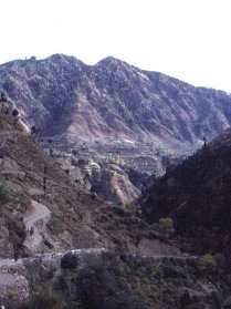On the way we walked through a number of small villages, stopping in Durga Gali for some tea, where we finished off our biscuits. There was snow on the ground and it was very cold, but it was not cold enough for it to snow again, and the showers that fell were rain showers. Fortunately they were not heavy and by early afternoon the weather started to brighten up again. Just outside one village we met two young boys who were shooting at targets with an air gun that had no sights. They let us have a few shots, but without the sights we couldn't hit anything and so we gave up. As we walked away they tried to ask us for 1 Rupee. A good try, but we didn't pay them anything. By the time we had walked 8 miles all uphill, we were both dead beat, but at least the rest of the way was downhill. Somehow we managed to walk the next 4 miles into Ghora Dakka, where the International Youth Hostel book said there was a hostel. Our walk down hill was helped at one point when a loose cow took a liking to us. It came a bit too close for comfort and we both broke into a trot trying to get away as it followed us down the road for about half a mile. When we eventually reached Ghora Dakka we were not able to find the youth hostel. The locals told us that there wasn't a hostel there, even though it was clearly marked in the Youth Hostel handbook. We decided to leave the main road and walk an extra mile to another hostel in Khanspur. While looking for the hostel in Khanspur we met somebody who spoke very good English. He gave us directions on how to find the hostel, but as we started to walk away he called us back and invited us to stay with him in his house, which we gladly accepted. His name was Mufti and his house turned out to be a former British Army billet. He had a lovely roaring log fire burning and we just sat in front of it and thawed out. He looked after us well that night, feeding us and chatting about the times when British Army personnel and their families used to flock to this area for their leave. The climate here in summer is very pleasant and they would come just to get away from the heat. The next morning at exactly 8am, Mufti woke us up by bringing us tea